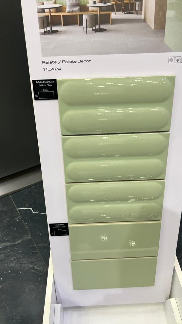 دکور سرامیک پالت سبز پولیش 11.5/24 از تولیدات جدید کاشی مرجان می باشد که می توانید برای دیوار آشپزخانه, سرامیک سبز پولیش برای بین کابینتی,سرامیک سبز برای دیوار سرویس بهداشتی و حمام و... استفاده نمایید.