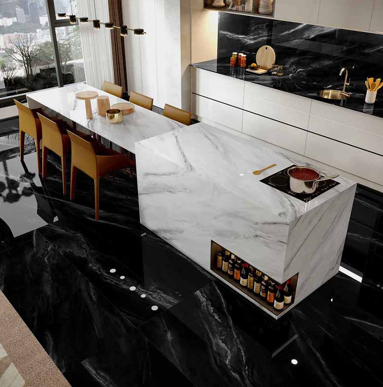 سرامیک سایز بزرگ استنفورد مشکی طرح دار همچنین برای دیوار لابی ساختمان, کف لابی و اسلب نمای خارجی ساختمان استفاده می شود.