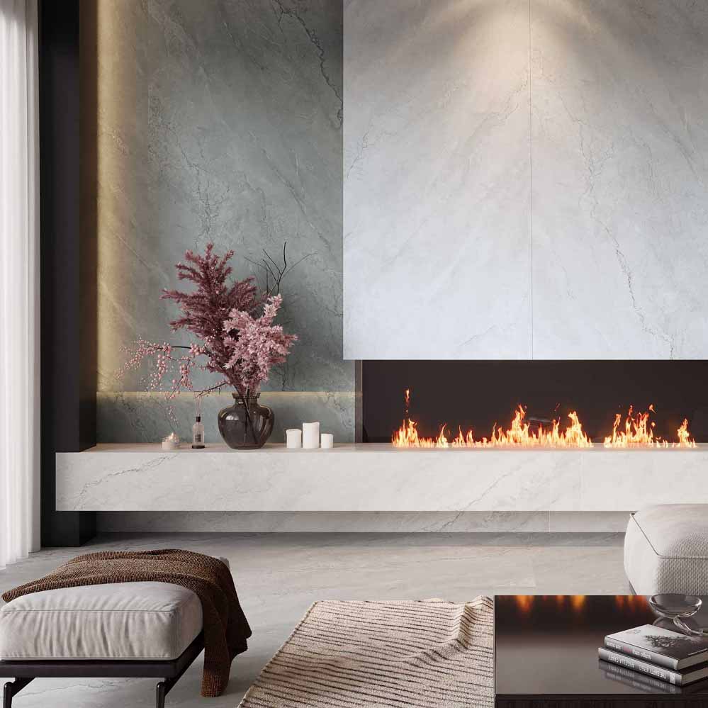 سرامیک سایز بزرگ رایان طوسی طرح دار همچنین برای دیوار لابی ساختمان, کف لابی و اسلب نمای خارجی ساختمان استفاده می شود.
