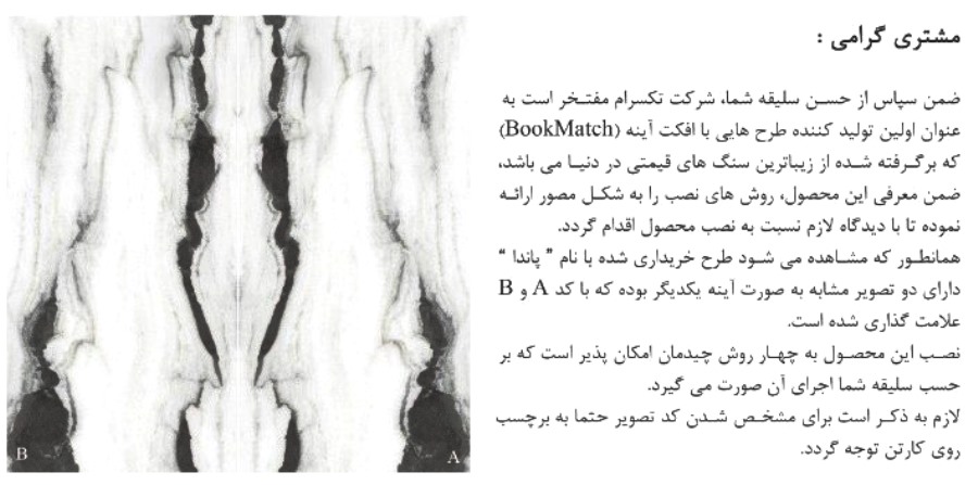 بوک مچ، به نوعی قرارگیری سنگ های با ابعاد بزرگ در کنار هم گفته می شود که در طی آن رگه های سنگ و نقوش آن در امتداد هم قرار می گیرند که بسته به فضای مدنظر می توان دو و یا چهار قطعه سنگ اسلب را بوک مچ نمود. امروزه تنوع در ساختاراین کار کاملا سلیقه ای بوده و طراح با هنر و نظر خود می تواند با قرار دادن اسلب های مختلف در کنار یکدیگر اشکال مختلف ایجاد نماید که هر یک منحصر به فرد و تکرار ناشدنی می باشند. برای همه ی دست اندر کاران کاشی و سرامیک تجربه شده است که بعضی از سنگ ها به تنهایی زیبا نیستند و به عنوان سنگ های با طرح شلوغ شناخته می شوند ولی زمانیکه با صرف سلیقه و ذوق در کنار هم قرار گیرند تبدیل به یک تابلو هنری زیبا می شوند. انتخاب طرحی زیبا در بین تمامی طرح های موجود در بازار کار سختی می باشد اما وقتی طرحی با طرف فکر و هزینه تولید می گردد می توان بسیار خاص جذاب و دلپذیر باشد. افرادی که دنبال طرح هایی هستند که محیطشان را متفاوت کنند طرح های بوک مچ تکسرام می تواند انتخابی یرکانه باشد. زمانی می توان اقدام به بوک مچ کردن نمود که سنگ دارای خطوط و طرح های شاخص باشد مانند خطوطی سیاه در بستری به رنگ سفید و در هنگام نصب باید به نحوی در کنار یکدیگر قرار بگیرند که به صورت سر به سر در پهلوی هم قرار گرفته تا نقش سنگ قطع نشود و طرح به صورت پیوسته امتداد یابد و حاصل منظره ای زیبا و متقارن ایجاد خواهد شد که در طبیعت نیز نمونه های مشابه زیادی همچون باله ای پروانه و یا گلبرگ های متقارن یک گل وجود دارند. زنده بودن و طبیعی بودن محیط را می توان در طرح های بوک مچ به وضوح لمس نمود.