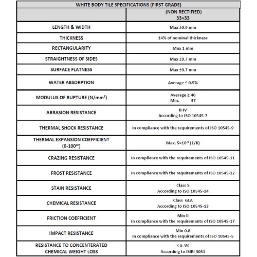 لازم به ذکر است که کاشی های ضد اسید به کاشی هایی اطلاق می گردد که کل بدنه (و نه صرفا سطح آن) در مقابل اسید ها مقاوم می باشد و با توجه به اهمیت این موضوع و نظر به اینکه رعایت حقوق مصرف کنندگان و صادرات کاشی های ضد اسید (که در فوق به آن اشاره گردید)برای این شرکت بسیار حائز اهمیت می باشد لذا تولید این کاشی نه تنها بر اساس استاندارد ملی ایران صورت می گیرد بلکه از نظر مشخصات فنی با استاندارد EN 176 اروپا که مشخصات فنی آن در صفحه آخر جنرال کاتالوگ در قسمت مربوط به کاشی های (VITRIFIED( WHITE BODY درج گردیده است نیز منطبق می باشد .