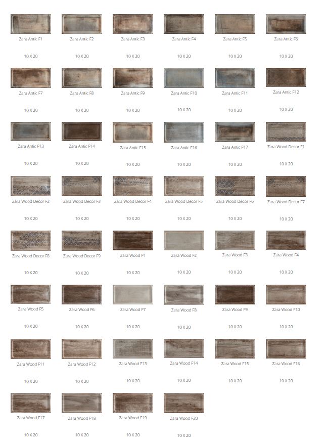 کاشی زارا در سه تیپ کاشی زارا آنتیک،کاشی زارا وود و کاشی زارا طرح دکور چوب تولید می گردد. که هر کدام از این تیپ ها در چند فیس مطابق تصویر تولید قابل رویت است.