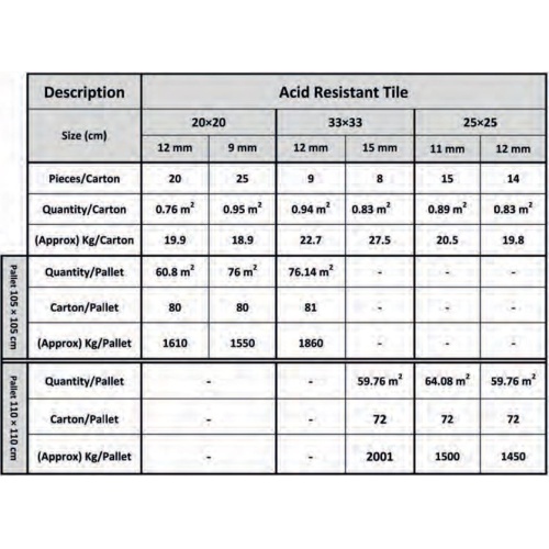 شامل شکل کاشی ، ابعاد و ضخامت آن میباشد که در این رابطه محدویت خاصی برای کاشی های ضد اسید وجود ندارد .در واقع کاشی های ضد اسید به هر شکل ، اندازه و ضخامتی که قبلا تعریف شده باشد قابل عرضه خواهد بود ، لیکن حدود رواداری اندازه در کاشی ضد اسید به شرح زیر میباشد.
