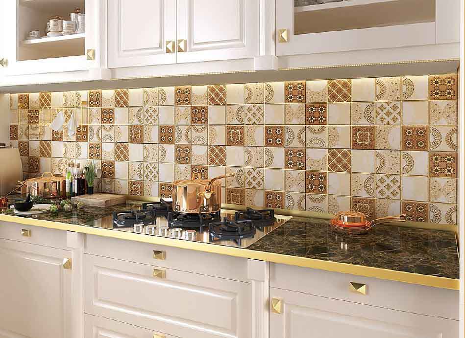 | کاشی و سرامیک دیوار, محل مصرف دیوار آشپزخانه و سرویس بهداشتی, کاشی بین کابینتی طلایی | |